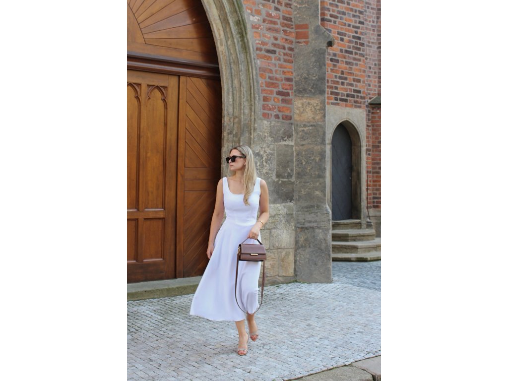 Elegantní a nadčasové midi šaty s vysokým pasem, které dokonale podtrhnou ženskou siluetu. Střih jemně obepíná trup a směrem dolů se rozšiřuje do kolové sukně, která se půvabně pohybuje při chůzi. Ramínka poskytují pevnou oporu a čisté linie šatů působí minimalisticky.