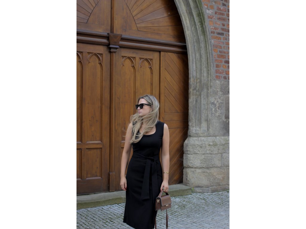 Tyto nadčasové černé šaty jsou ideální volbou pro ženy, které hledají kombinaci elegance, jednoduchosti a pohodlí. Střih bez rukávů zvýrazňuje ramena, zatímco úzká silueta s látkovým páskem v pase krásně tvaruje postavu a umožňuje přizpůsobit šaty dle potřeby. Vlnitý výstřih dodává modelu ženskost a jedinečný elegantní vzhled. Midi délka působí decentně a díky rozparku vzadu poskytuje volnost při chůzi.
