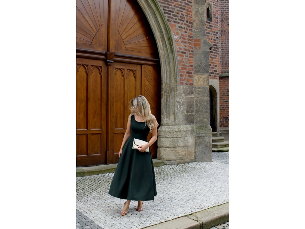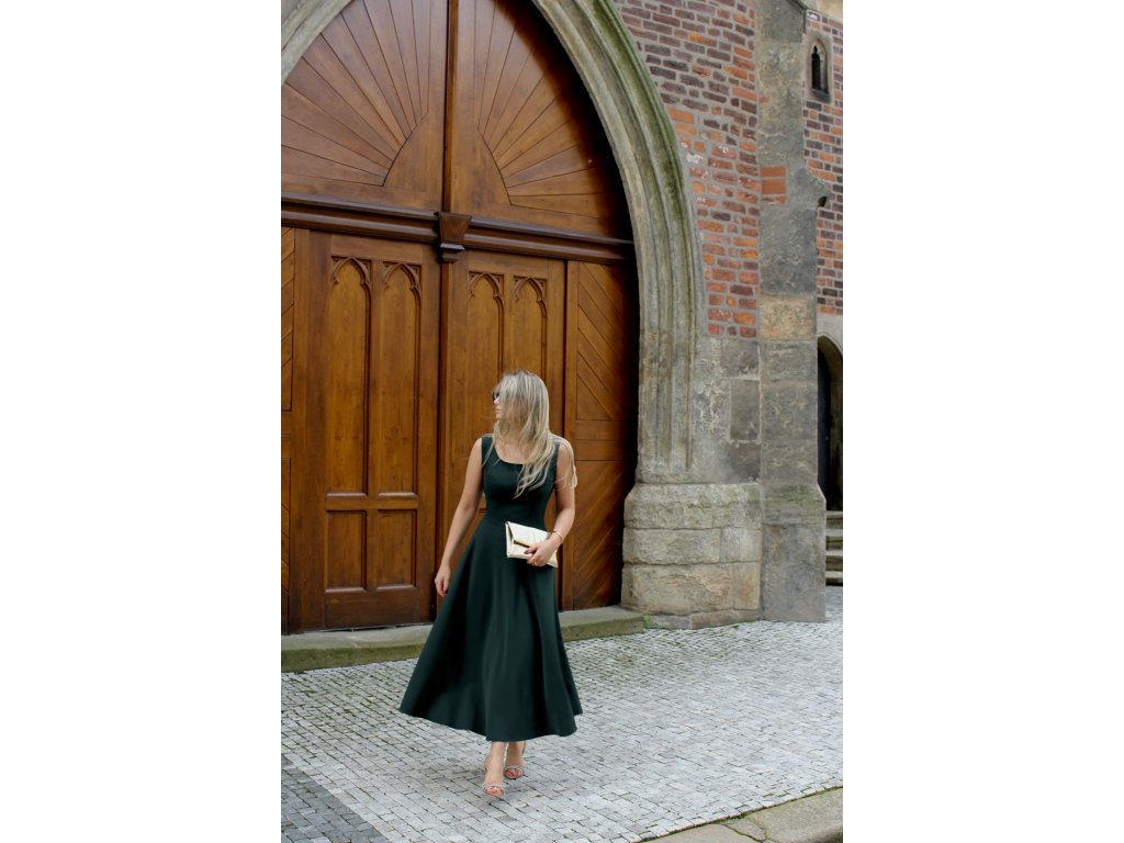 Elegantní a nadčasové midi šaty s vysokým pasem, které dokonale podtrhnou ženskou siluetu. Střih jemně obepíná trup a směrem dolů se rozšiřuje do kolové sukně, která se půvabně pohybuje při chůzi. Ramínka poskytují pevnou oporu a čisté linie šatů působí minimalisticky.